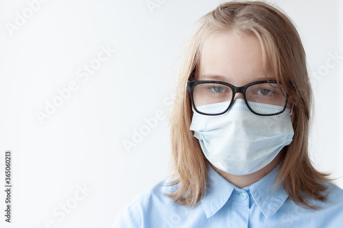 A teenage girl, blonde, in a blue shirt, a medical mask and glasses on a white background