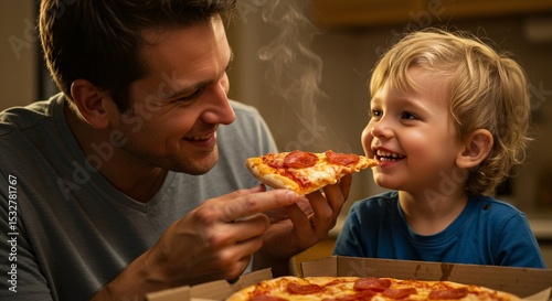 A tender moment as a smiling father offers a hot slice of pepperoni pizza to his delighted young son in a warm, family setting.