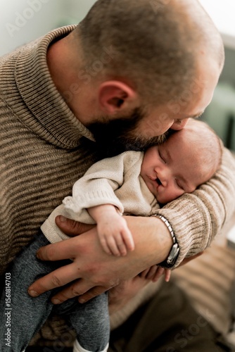 A tender moment between a father and his newborn baby, both lying on a soft surface. The father is gently kissing the baby's forehead, showcasing love and affection.