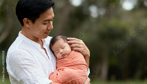 A tender portrait of an Asian father holding his sleeping newborn baby outdoors. Fatherhood and family bonding concept
