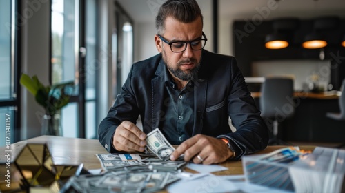 A thoughtful businessman meticulously counts dollar bills at a sleek, modern desk, highlighting focus and financial acuity.