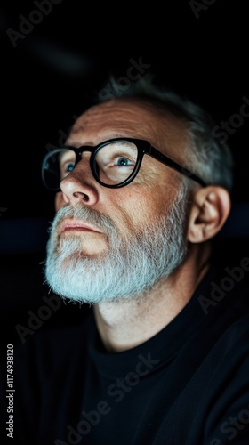 man, goggles, beard, thoughtful, contemplation, sharpened, low light, mature, serious, reflective, looking up, portrait, closeup, concentration, grey hair, introspection, depth, dark background, pensive, analytical, mood, intelligent, solitary, mystery, soft light, studio, deep thought, modern, intellectual, professional, artistic, detailed, serenity, wisdom, calm, monochromatic, isolation, texture, elegant, quiet, vertical