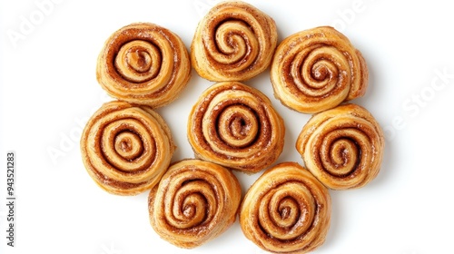 A top view of freshly baked cinnamon rolls, arranged in a tight circle, isolated on a white background, with emphasis on the spiral patterns and rich filling