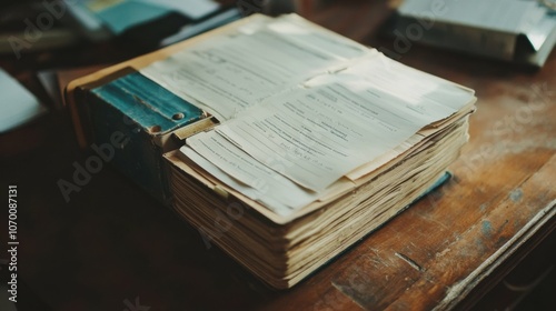 A top-down view of a binder filled with documents, resting on a table. The focus is on the binder's design and organization.