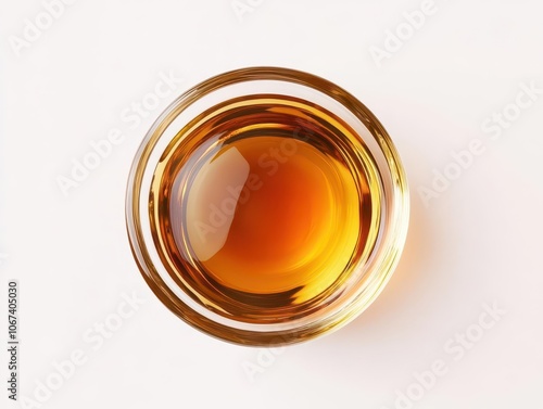 a top-down view of a clear glass bowl filled with rich amber-colored liquid, highlighting its glossy texture against a pristine white background, perfect for beverage marketing