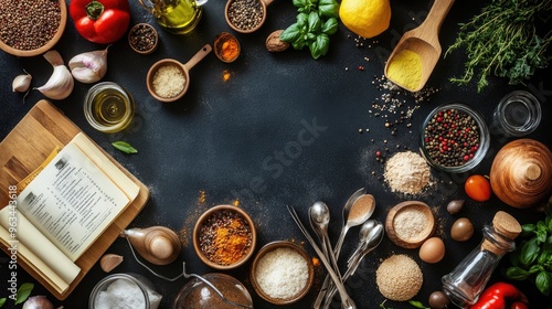 A top-down view of a neatly arranged kitchen counter with various ingredients, measuring spoons, and a recipe book, ready for meal preparation.