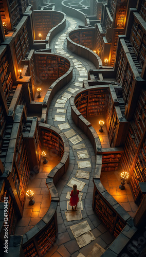 labyrinth, bookshelf, cognition, learning, discovery, conceptual, intricate, symbolic, journey, literature, education, imagination, surreal, vibrant, depth, hi-res, artistic, adventure, mystery, storytelling, research, study, curiosity, complex, abstract, layered, detailed, fantasy, creative, perspective, metaphor, labyrinth, wisdom, intelligent, structured, philosophy, inspiration, literary