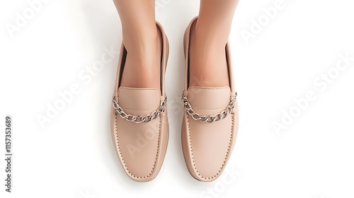 A top-down view of two feet wearing loafers, The shoes are tan with chain detailing, displayed on a white background.
