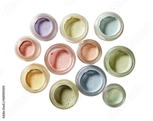 powder, jar, cosmetic, pastel, colours, make-up, beauty, skincare, container, circular, arrangement, texture, product, fragrance, organic, natural, subtile, soft, light, toned, pigment, colourful, many-coloured, diverse, decorative, smooth, refined, powdery, cream, compact, face, body, eyeshadow, reddening, highlight, shimmer, gloss, delicate, modern, cardboard box, various, collection