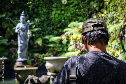 A tourist is praying and wishing to the statue of Lakshmi or Shri the goddess of wealth, fortune, power, beauty, fertility and prosperity in Hinduism at the GWK Cultural Park with defocused background