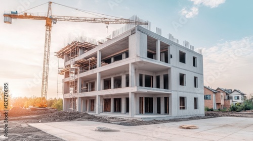 A towering skeleton of a building rises against the sky, a crane looming above, as workers bustle below, shaping the future of urban architecture.
