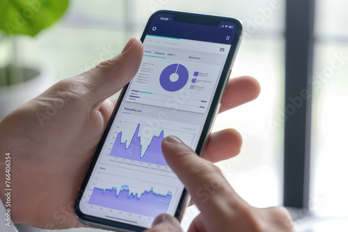 A trader or a financial analyst holding phone and looking at finance market graph. Stock market trading, virtual cryptocurrency and investment concept.