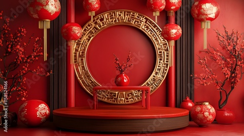A traditional Chinese-style wooden podium surrounded by vibrant red and gold decorations, with space for displaying a product in the center