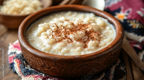 A traditional Mexican dessert, arroz con leche, rice pudding flavored with cinnamon, served in a rustic bowl