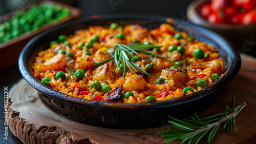 traditional, seafood, paella, pan, tavern, hue, fresh, rice, green peas, rosemary, favor, spanish, cookery, delicious, meal, culinary, coastal, gastronomy