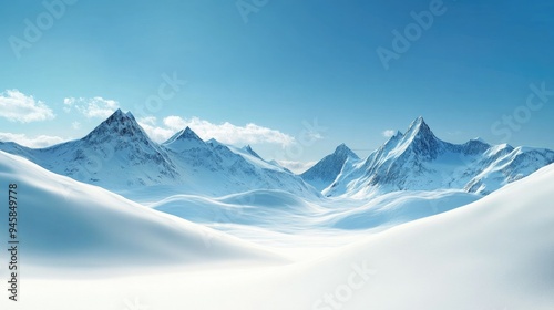 A tranquil winter landscape with snow-covered mountains and a clear blue sky.