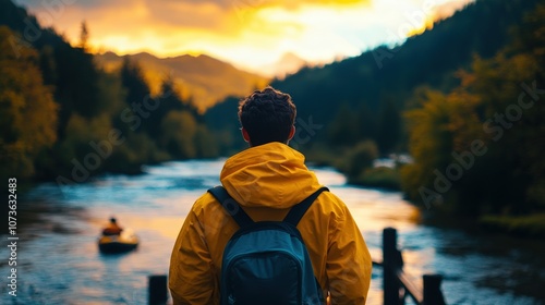 A traveler overlooking a scenic river surrounded by mountains at sunset.