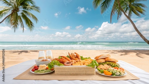 beach, seafood, picnic, tropical, ocean, get-away, escape, paradise, dining, resort, palm, relaxation, luxury, sunlight, menu, exotic, sand, lunch, lettuce, breeze, tomatoes, platter, snack, toast, culinary, burger, crab, shrimp, leisure, epicure, glasses, blue, holiday, sky, destination, celebration, meal, vacation, nature, adventure, fruit, travel, summer, fresh, landscape, coast, view