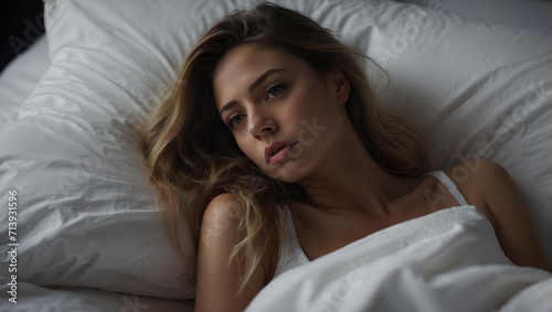 A troubled woman can't get out of bed, depression or sadness is overwheliming