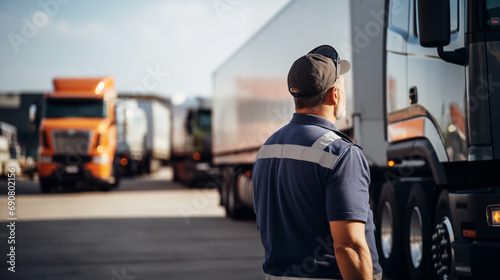 A truck driver inspecting the cargo in the trailer, Truck driver, blurred background, with copy space