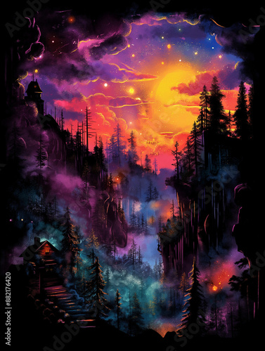 A t-shirt design of a mystical forest scene at sunset with vibrant colors, showing a quaint cottage, towering trees, and a starry sky with a silhouetted mountain range in the background.