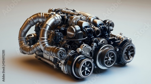 A turbocharged car engine in 3D, with intricate piping and detailing, displayed on a pure white surface