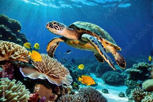 A turtle swims over a colorful coral reef, surrounded by various species of fish