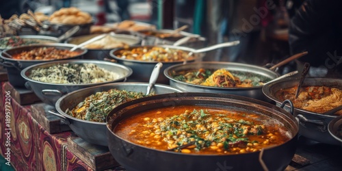 A variety of colorful dishes, including curries and salads, displayed on a table at a market. The dishes are arranged in a visually appealing manner, with a focus on vibrant colors and textures.