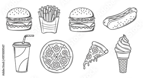 burger, fries, hot dog, soda, pizza, ice cream, fast food, food, eatery, meal, snack, lunch, dinner, beverage, drink, sandwich, cone, cup, straw