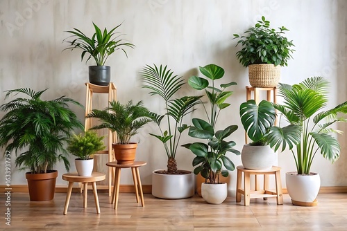 A variety of lush green houseplants displayed on wooden stands against a textured wall