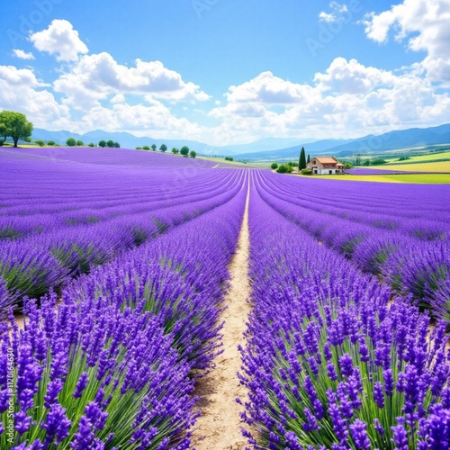A vast lavender field in full bloom under a bright summer sky. The rows of purple flowers stretch into the distance, with a rustic farmhouse and distant mountains completing the idyllic setting.