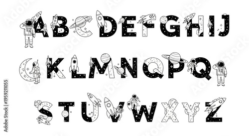 A vector graphic illustration of a space-themed alphabet for kids
