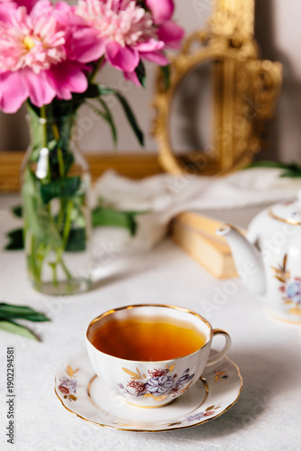 tea, cup, peony, vintage, flower, morning, cosy, porcelain, pink, still, life, romantic, vase, bouquet, gold, frame, spring, relaxation, breakfast, table, elegant, vertical, background, saucer, teapot, hot, drink, herbal, book, retro, antique, home, lifestyle, glasses, decoration, bloom, blossom, plant, blurred, closeup, fresh, beautiful, art, style, classic, beverage, nostalgia, soft, sharpened