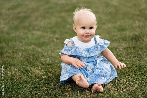 A very cute little blue-eyed baby girl in a blue dress sits on the grass barefoot and smiling, on the nature