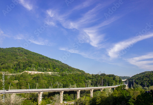 A viaduct built along and around the mountain. View in spring green nature. Construction of the air road. Highway, highway, freeway.