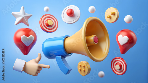 A vibrant 3d render of a megaphone surrounded by social media icons like hearts, targets, and a pointing finger