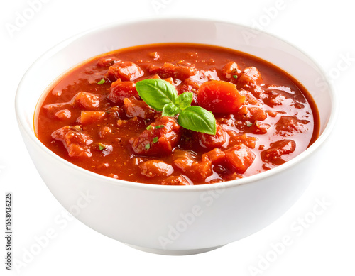 A vibrant and flavorful chunky tomato sauce, generously garnished with a fresh green basil leaf.
