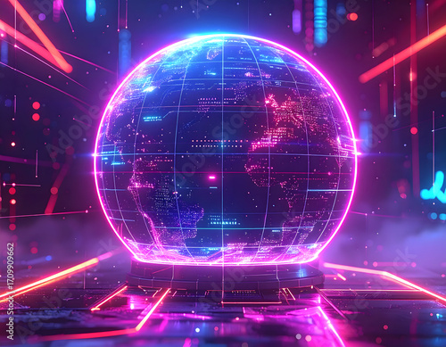 A vibrant and futuristic digital globe illuminated with neon lights, representing global connectivity and technology