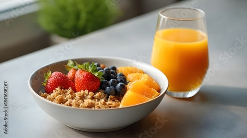 breakfast, bowl, granola, fruit, strawberry, blueberry, orange, juice, healthy, fresh, oat, cereal, muesli, fruit, strawberry, blueberry, citrous, berry, meal, nourishment, diet, food, ingredient, ripe, sweet, juicy, delicious, taste, favor, organic, natural, wholesome, drink, beverage, refreshing, liquid, glasses, container, table, surface, background, light, sunlight, bright, clean, simple, indoor, morning, energy