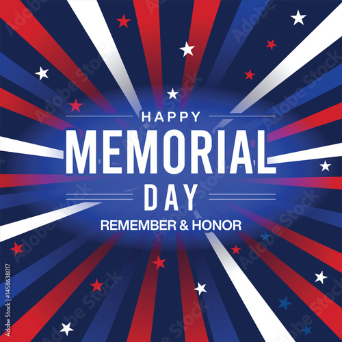 A vibrant and patriotic illustration celebrating Memorial Day, featuring red, white, and blue rays, along with stars and bold text that reads "Happy Memorial Day" with "Remember & Honor." Perfect for