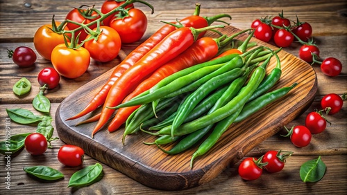 a vibrant arrangement of fresh green beans, crisp carrots, red bell peppers, and plump cherry tomatoes on a rustic wooden cutting board"