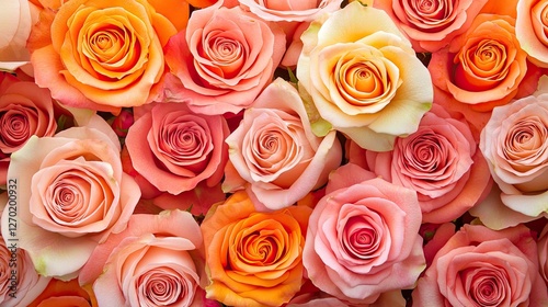 A vibrant array of orange and pink roses, creating a colorful background with ample copy space.