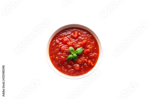 A vibrant bowl of homemade tomato sauce, simmered to perfection, crowned with fresh basil, ready to elevate any pasta dish with its rich, rustic charm.