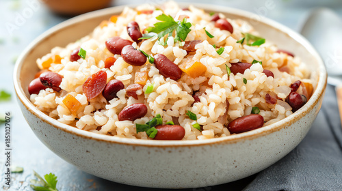 A vibrant bowl of rice mixed with colorful vegetables and kidney beans, topped with fresh herbs for a nutritious meal.