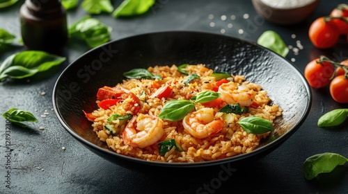 shrimp, rice, fried, basil, vegetable, seafood, meal, cookery, dining, tasty, colourful, aromatic, garnish, dish, fresh, healthy, italian, siam, dinner, lunch, cooking, eatery, plate, flavorful, enjoyment, ingredient, pepper, tomatoes, bowl, green, ingredient, delicious, epicure, food, eat, organic, preparation, serve, cook, aroma, presentation, pan, vegetable, meat, chicken, frying, onion, paella, hot