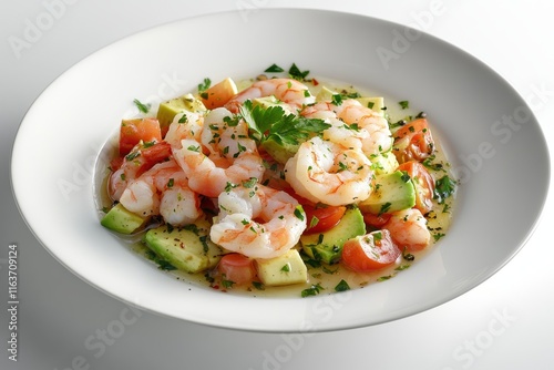 A vibrant bowl of shrimp salad with fresh vegetables, showcasing a healthy and colorful meal option.