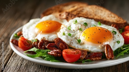 A vibrant breakfast plate featuring perfectly fried eggs, fresh vegetables, and crunchy toast, embodying wholesome nutrition and a delightful start to the day for food enthusiasts.