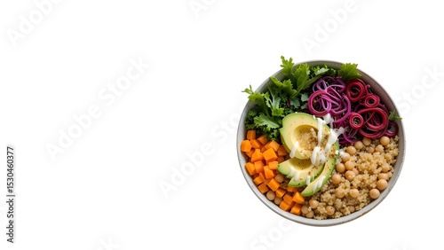 A vibrant buddha bowl featuring fresh vegetables and grains on a clean white background studio shot
