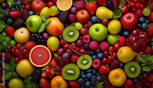 A vibrant canvas of different berries, including strawberries, blueberries, blackberries, raspberries, cranberries, gooseberries, red currants, elderberries, goji berries, and cloudberries, showcasing