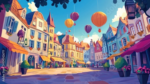 A vibrant cartoon festival in a European town square, with copy space for festive messages